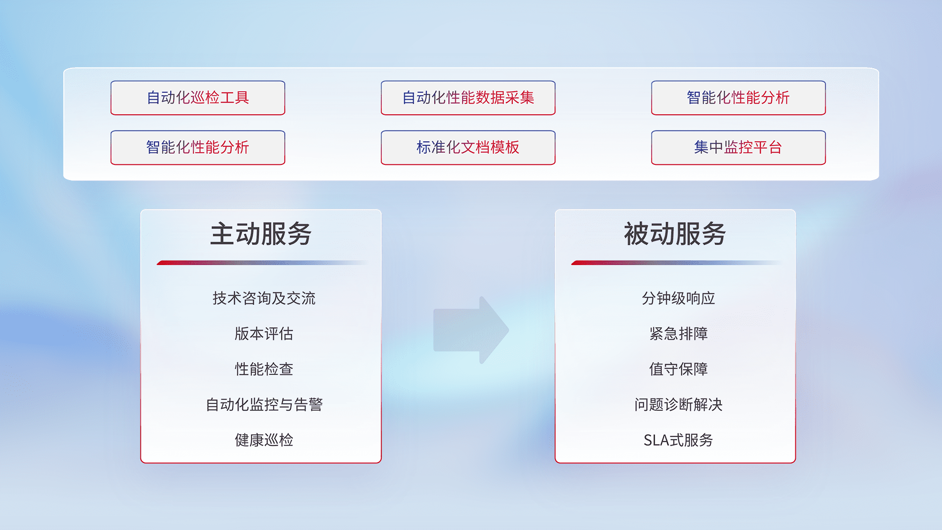智能化工具和标准化文档,,,,保障服务质量,,,,提供主动服务(包含技术咨询、、、、版本评估、、性能检查、、自动化监控与告警、、、、健康巡检)和被动服务包含(分钟级响应、、、紧急排障、、、、值守保障、、问题诊断解决、、、、SLA服务)。。。。